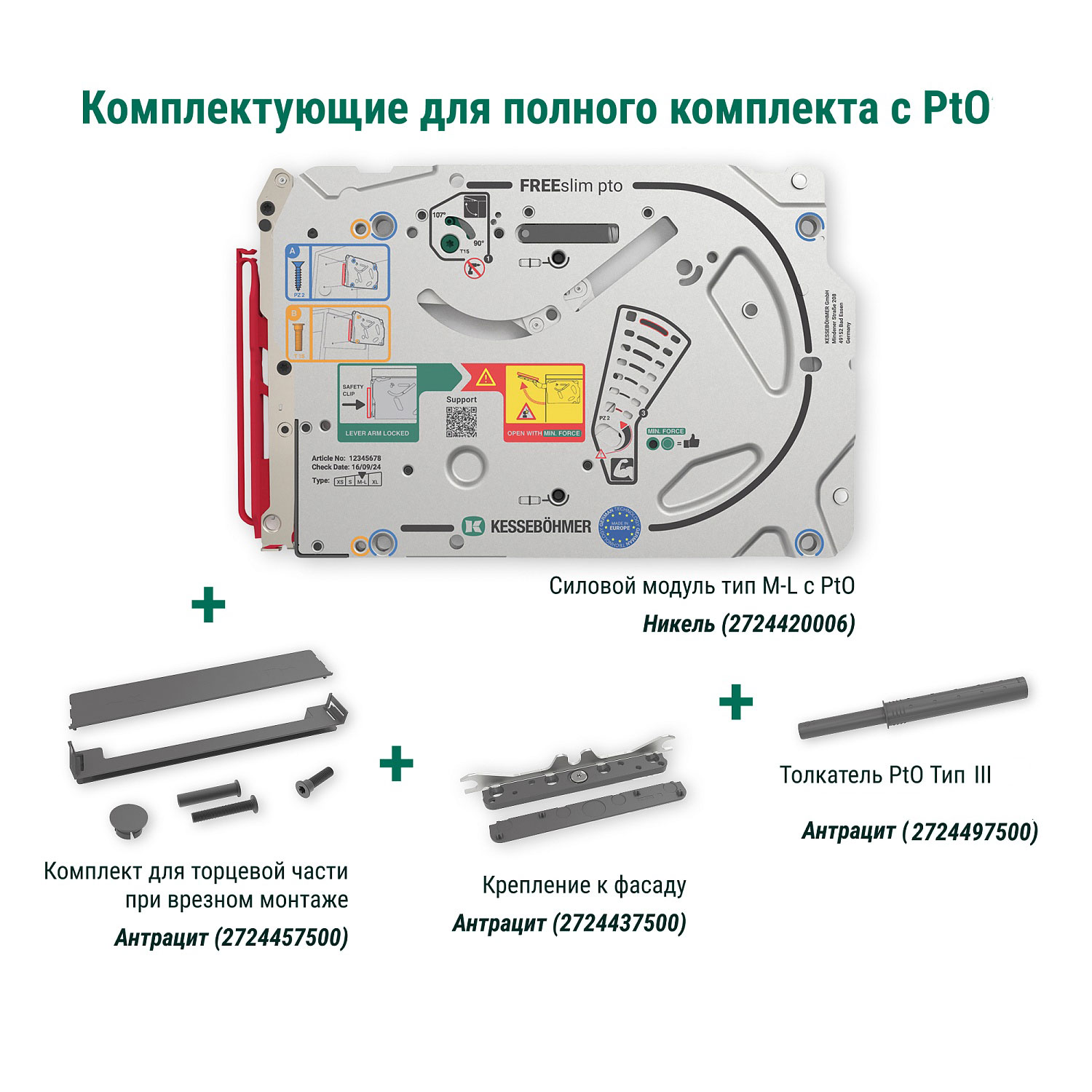 Полный комплект ультратонкого подъемного механизма ФриСлим ФЛАП Kesseböhmer c толкателем PTO тип III для врезного монтажа, цвет АНТРАЦИТ
