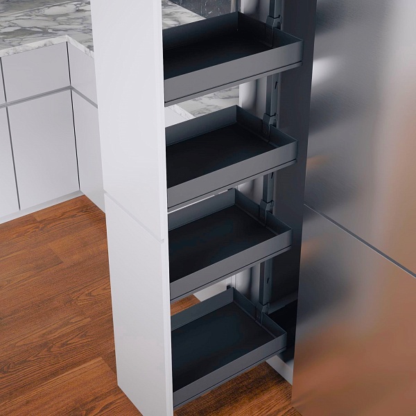 • Высокая нагрузка на механизм в 100 кг (по 18 кг на полку) позволяет организовать хранение большому количеству предметов, при этом даже при полной загрузке система выдвигается легко.